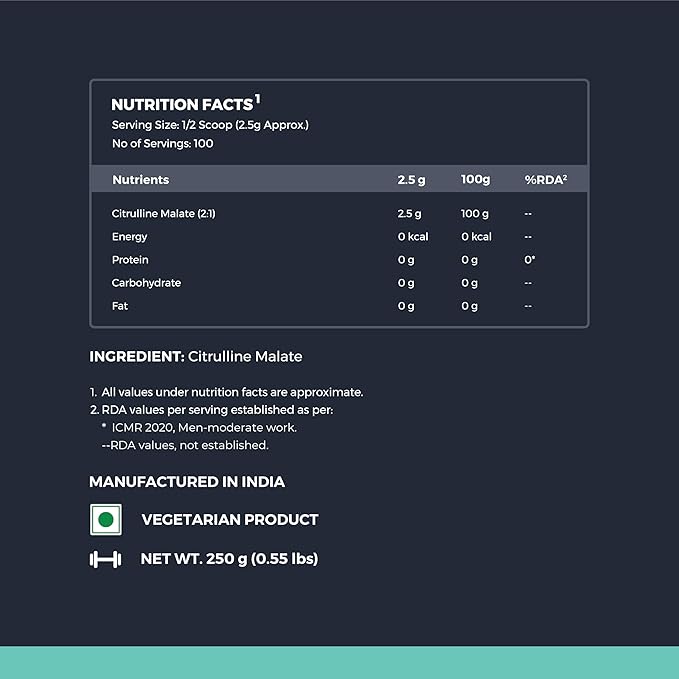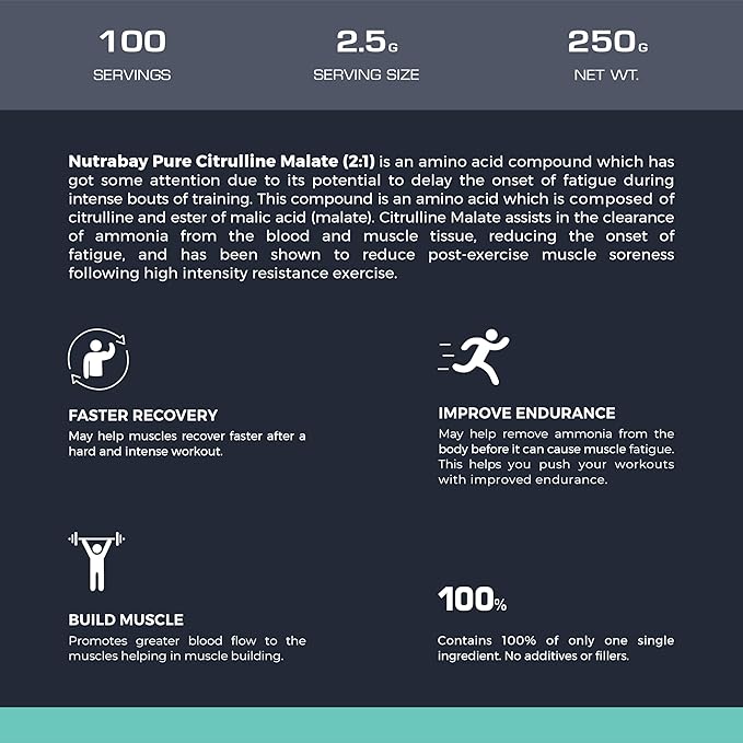 Formulated for athletes, gym-goers, and fitness enthusiasts, Nutrabay Pure 100% Citrulline Malate is a high-performance pre-workout supplement designed to enhance endurance, blood flow, and muscle recovery. Each serving delivers 2500mg of pure Citrulline Malate to give you a powerful pump and stamina boost β without any added sugar, flavour, or fillers.