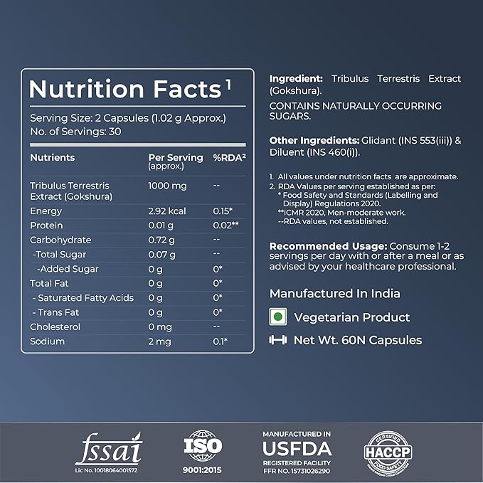 Nutrabay Wellness Tribulus Terrestris, also known as Gokshura, is a powerful Ayurvedic supplement designed especially for bodybuilders, athletes, gym enthusiasts, and active individuals. Each serving delivers 1000mg of Tribulus Gokshura, standardized to 20% saponins — the key active compounds that help promote natural testosterone production, muscle growth, and enhanced strength.